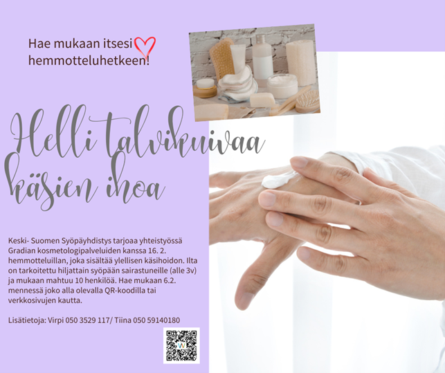 Muista antaa aikaa itsellesi ja itsestäsi huolehtimiseen. Pienilläkin asioilla voit merkittävästi lisätä omaa hyvinvointiasi. Pakkaskeleillä myös kädet kaipaavat erityishuomiota ja siksi tarjoammekin nyt mahdollisuuden hakea mukaan ylelliseen käsienhoitoon Gradialle 16.2 klo 17–19. Ilta on tarkoitettu hiljattain syöpään sairastuneille (alle 3 v) ja mukaan mahtuu 10 henkilöä. Hae mukaan 6.2. mennessä oheisella linkillä.